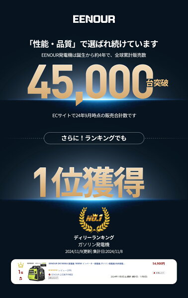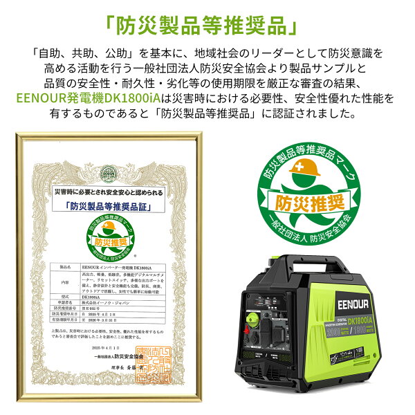 【1/2当選率でP100%返還 49,900円】EENOUR DK1800iA 発電機 1800W 【防災推奨品】 インバーター発電機 ガソリン発電機 防音発電機 ポータブル電源発電機 小型 防災グッズ 超軽量 電源 キチンカー 停電 キャンプ 停電対策 正弦波 台風 地震 防災用 移動販売