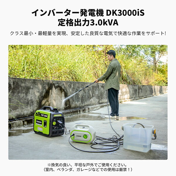※ご使用の前には、接続機器の消費電力と起動電力を必ずご確認ください。 ※換気の良い、平坦な戸外でご使用ください。(室内、ベランダ、ガレージなどでの使用は厳禁!) (以下のキーワードに興味がある方はぜひ商品ページをご覧ください:発電機 インバーター発電機 ガソリン発電機 ポータブル発電機 セル発電機 防音発電機 リモコン起動 移動販売 農業用 無人機充電 園芸用 発電機 自家発電 屋外作業 アウトドア レジャー キャンプ BBQ ガーデニング DIY 溶接機搭載可能 電力 発電 軽量 ガソリンエンジン式 エンジン発電機 非常用電源 緊急電源 防災 防災用品 地震 農業 業務用 家庭用 小型軽量 コンパクト 省エネ エコ 直流出力 現場 土木 建築 土建 工事現場 建築現場 イベント 日曜大工 船 ボート バッテリー充電 持ち運び 本田 ヤマハ 工進 やまびこ) 商品説明型番 DK3000iSインバーター発電機■商品仕様 定格出力:3.0kVA 駆動方式:空冷4ストロークOHVエンジン 連続運転時間:約2.5h(100%負荷) 約6h (1/4負荷) 騒音レベル(7m):59dB 定格周波数:50Hz/60Hz AC出力:100V 30A USBポート:5V 1A/5V 2.1A(USB-A)5V 3A(USB-C) タンク容量:4L 使用燃料:無鉛レギュラーガソリン 重量:21KG 排気量:145cc ※使用環境:換気の良い、平坦な戸外でご使用ください。(室内、ベランダ、ガレージなどでの使用は厳禁!) 本体サイズ:480×290×440mm PSマークの種類:PSE 届出事業者名:株式会社ジャパンストライド 登録検査機関名称:TÜV RHK ■付属品差替式ドライバー、点火プラグ交換用レンチ、エンジンオイル用ホース、漏斗、日本語取扱説明書 ■ポイント1★3.0kVAクラスで最軽量を達成 独自技術で開発した小型多極マグネトウ発電体を採用することで発電効率をより一層向上させております。3.0kVAの高出力を達成しながら、わずか21kgの軽量ボディを実現しています。本機DK3000iS:約21kg K社GV-28i:約38kg H社EU28is:約61.2kg Y社EF2800iSE:約68kg ■ポイント2 ★低騒音設計で静かな運転音を実現 作動音の発生源であるエンジンを防音ポックスで覆い、外装ボディーも内部の音漏れを防ぐ作りとなる二重防音構造で、最小59dB(7m)と群を抜く静粛性を実現しています。 ■ポイント3★工事現場に対応する高出力を持つ 3.0kVAの高出力で、冷蔵庫、洗濯機、エアコンなどの大型家電だけでなく、建設工事や内装工事などで使用する高負荷の電動工具にもしっかり対応できます。 ■ポイント4★多機能なマルチメーターを搭載 デジタルマルチメーターを搭載、発電機の出力電圧、周波数やメンテナンス時期を把握できる累積使用時間がローテーションで表示されます。電力使用目安や燃料残量も一目で分かります。 ■ポイント5★品質および安全性を確保 電気用品安全法に従って製品の安全が認められた商品に貼り付けられるマーク。電気機器として信頼と安心のマークです。EENOUR 発電機は、優れた製造設備と技術を集積した工場で生産されており、厳しい検査を受けて出荷されています。EENOURの厳しい品質基準に合格した製品だけをお客様にお届けしています。また、PSE認証取得済み、多重な保護回路を搭載で安心してご使用いただけます。▼ 最新型の発電機はこちら ▼ ▼ ガソリン発電機を探しの方はこちら ▼ ▼ ガソリン・LPガス両用の発電機 ▼