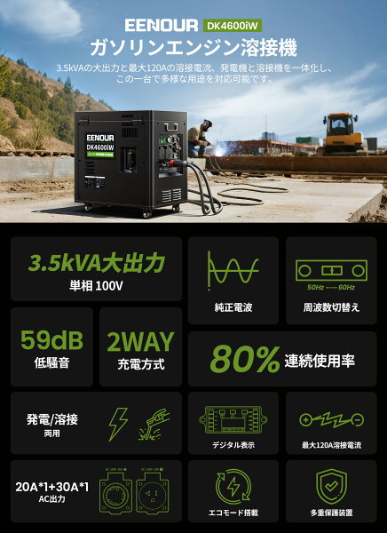 【1/2当選率でP100%返還 169,900円】EENOUR ガソリンエンジン溶接機 DK4600iW 最大出力4000W 超低騒音型 ガソリン 発電機 インバーター 発電機 溶接機 MMA溶接 42kg 同クラス超軽量 120A大電流 定格使用率80% エコーモード 100V ホイル付き 工事用 戸外DIY 日曜大工