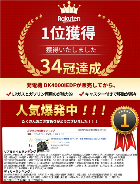 メーカー希望小売価格はメーカーカタログに基づいて掲載しています 商品説明 ■型番 イーノウ DK4000iEDF LPガス&ガソリン両用発電機 ■商品仕様 定格出力:3.5kVA(ガソリン)/3.2kVA(LPガス) 使用燃料:LPG(プロパンガス)、無鉛レギュラーガソリン ※2つの燃料を同時に使用することはできません。 ガソリンタンク容量:5.8リットル エンジンオイル量:0.45リットル 本体サイズ(ハンドル&車輪を含む):530*310*500mm 乾燥重量:27kg 始動方式:リコイルスターター/セルボタン/リモコン 駆動方式:空冷4ストロークOHVエンジン 連続運転時間(定格出力):約1.19kg/h(LPガス)/約2.7h(ガソリン) 連続運転時間(エコモード): 約0.8kg/h(LPガス)/約8h(ガソリン) 定格周波数(切替式):50Hz/60Hz AC出力:100V/20A(2口)、100V/30A(1口) DC出力:12V/8.3A 排気量:223cc 騒音レベル(7mの距離からエコモードONの時):59db ■ポイント1 ★セルスターター(リモコン付き)で遠隔操作可能!簡単エンジン始動! スイッチ/リモコン/リコイル式、始動方法は3Wayです。 「リコイル式発電機の始動がチョット・・・」というご年配の方や、独自に開発したセルスターター機能を備え、誰でもワンプッシュで簡単にエンジンを始動することが可能になりました。 セルスターター用バッテリーの残量がゼロになる時は、リコイルスターターでエンジンをかけられます。 付属のリモコンを使うと、遠く離れた場所からでも発電機のオンオフを手軽に操作が可能です。 ■ポイント2 ★ガソリンとLPガスが使える 燃料には利便性が高いLPガスを採用し、さらにガソリンも使用できるハイブリッド式発電機です。燃料切り替えはボタンを押すだけ! ■ポイント3 ★キャスター付きで楽々移動できて、停電時以外にアウトドアでも活躍 正弦波インバーター搭載、防音設計、エコスロットル、直流バッテリー充電、さらにキャリーハンドルや大型ホイール搭載で移動も他の発電機に比べて圧倒的にコスパが高い機種です。 ■ポイント4 ★ボルト/時間メーター/周波数/燃料/使用中の電力が一目で分かる オイル交換などの特定のメンテナンス時間を測定するために、マルチメーターに使用時間、エアフィルターの交換などのデータが表示されるので、メンテナンス作業に非常に便利です。正常なエンジンの管理にも役立ちます。国内有名なメーカーと比較しても、劣らないのインバーター発電機です。 ■ポイント5 ★高出力&安定電力供給 高品質の電源を供給する正弦波インバーターを搭載しているインバーター発電機です。精密機械やマイコン制御の電化製品などにも安心してご利用いただけます。 AC100V電源とDCシガーソケットを装備し、スマホやパソコンなどの電気機器を使用しながら、車載機器の充電も可能です。 ※消費ワット数は目安ですので実際に使用する家電製品により異なる場合がございます。 ■ポイント6 ★直列&並列運転で幅広い機器に対応 並列/直列運転接続ボックス(別売り)で2台直列運転の場合、200V対応&最大6300Wの出力が可能に、溶接機、電子レンジ、エアコンなどパワフル&スピーディーな家電製品が搭載可能になりました。 並列運転の場合、100V対応&最大6650Wの高出力を実現しました。 ※直列運転の場合:同機種、またはDK4000iAPS、DK4500iAEFI発電機と直列運転可能です。 並列運転の場合:同機種、または他のDKシリーズ型番の発電機と並列運転が可能です。 ■ポイント7 ★正弦波インバーター搭載 パソコン、スマートフォン、タブレット等の精密機器の充電に必要な正弦波電力インバーターを搭載、商用電源と同レベルの良質で滑らか波形を作り出して出力するため、安心で充電できます。 ■ポイント8 ★非常時大活躍、様々な場面に適用 停電や災害時など、非常時用電源として大活躍。他のシステムから給電する電源供給装置より、安価で利便性の高いインバータ発電機による高品質な電気を供給し、家電製品の使用、通信も確保できます。防災備え以外、建築作業、DIY作業、農作業、キッチンカーにも最適。 ■ポイント9 ★品質および安全性を確保 EENOUR 発電機は、優れた製造設備と技術を集積した工場で生産されており、厳しい検査を受けて出荷されています。EENOURの厳しい品質基準に合格した製品だけをお客様にお届けしています。また、PSE認証取得済み、多重な保護回路を搭載で安心してご使用いただけます。 ■ポイント10 ★安心保証 本製品は購入日より12ヶ月のサポート・保証を提供いたします。使用中に何か問題点がございましたら、お気軽にお問い合わせください。ご連絡いただく前に、注文番号と問題点を確認できる動画や写真などを、事前にご用意していただければ幸いです。 ■注意事項 ● ご購入時、発電機にはエンジンオイル・燃料は入っておりません。 ● 室内など、排気ガスがこもる場所では絶対に使用しないでください。 ● LPガスの供給に関しましては、お近くのガス販売店にご相談ください。 ● ご使用前には、必ず取扱い説明書をお読みください。 ●LPガスの接続について、下記の文字をクリックし