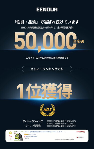 メーカー希望小売価格はメーカーカタログに基づいて掲載しています ※ご使用の前には、接続機器の消費電力と起動電力を必ずご確認ください。 ※換気の良い、平坦な戸外でご使用ください。(室内、ベランダ、ガレージなどでの使用は厳禁!) (以下のキーワードに興味がある方はぜひ商品ページをご覧ください:発電機 インバーター発電機 ガソリン発電機 ポータブル発電機 セル発電機 防音発電機 リモコン起動 移動販売 農業用 無人機充電 園芸用 発電機 自家発電 屋外作業 アウトドア レジャー キャンプ BBQ ガーデニング DIY 溶接機 搭載可能 電力 発電 軽量 ガソリンエンジン式 エンジン発電機 非常用電源 緊急電源 防災 防災用品 地震 農業 業務用 家庭用 小型軽量 コンパクト 省エネ エコ 直流出力 現場 土木 建築 土建 工事現場 建築現場 イベント 日曜大工 船 ボート バッテリー充電 持ち運び 本田 ヤマハ 工進 やまびこ) 商品説明型番 DK4500iAEFI 電子制御燃料噴射装置 セル式発電機■商品仕様 定格出力:3500VA 瞬間最大出力:4500VA 燃料タンク容量:5.8リットル エンジンオイル規定量:0.45L 全長×全幅×全高(mm):540×310×500 乾燥重量(kg):27kg 始動方式:電動スターター/リモコン/リコイルスターター 駆動方式:空冷4ストロークOHVエンジン 連続運転時間:定格連続運転時:3h1/4負荷連続運転時:10h 定格周波数(切替式):50Hz/60Hz 排気量:160cc 使用環境:換気の良い、平坦な戸外でご使用ください。(室内、ベランダ、ガレージなどでの使用は厳禁!) ■付属品プラグレンチ給油用ボトル取付説明書ドライバー ■ポイント1★発電機トップクラスのEFI電子制御噴射装置を搭載 1.ECU燃料噴射弁で高圧なガソリンを噴射し、気化したガソリンと空気を混合し、燃焼効率を向上させます。そして、供給されるガソリン量が最適に調整し、且エコーモードでエンジンの負荷を調整することで燃費を最適化し、燃料の効率的な利用と経済的で環境にやさしい運転が実現しました。2.イグニッショントリガーはモーターローターの輪郭を認識し、対応する回転数信号を燃料噴射ECUに送り、エンジンが理想な点火角度にあるときに点火装置を制御することで、起動効率を更に向上しました。3.キャブレターをEFI電子制御噴射装置に変わり、ガソリン抜きやメンテナンスなどが不要になり、保管性も向上しました。 ■ポイント2 ★キャスター付きで楽々移動できて、停電時以外にアウトドアでも活躍 正弦波インバーター搭載、防音設計、エコスロットル、直流バッテリー充電、さらにキャリーハンドルや大型ホイール搭載で移動も他の機種にくらべて圧倒的な機種です。 ■ポイント3★電圧/時間メーター/周波数/燃料/使用中の電力が一目瞭然 ! 操作パネルは非常に直感的で、ボルト、時間メーター、周波数、燃料レベル、使用中の電力を一目で確認できる設計で、発電機の使用状況を瞬時に把握し、より効率的な電力管理が可能になります。 ■ポイント4★高出力&安定電力供給 高品質の電源を供給する正弦波インバーターを搭載しています。精密機械やマイコン制御の電化製品などにも安心してご利用いただけます。 定格出力が3500Wもある、様々なシーンで大活躍!AC100V/200V電源とDC電源ソケット(12V)を装備し、様々な設備に給電することが可能です。 ※消費ワット数は目安ですので実際に使用する家電製品により異なる場合がございます。 ■ポイント5★直列&並列運転で幅広い機器に対応 並列/直列運転接続ボックスで2台直列運転の場合、200V対応&最大6300Wの出力が可能に、溶接機、電子レンジなどパワフル&スピーディーな家電製品が搭載可能になりました。 並列運転の場合、100V対応&最大6650Wの高出力を実現しました。 ※直列運転の場合:同機種、またはDK4000iAPS発電機と直列運転可能です。並列運転の場合:他のDKシリーズ型番の発電機と並列運転が可能です。 ■ポイント6★バッテリー充電口と0電量起動機能を増設 従来のセル起動式発電機より、バッテリーの充電口を増設しました。長期保管、またはバッテリーが上がった場合、指定仕様のACアタブターでバッテリーを充電することが可能になりました。更にバッテリー電量が0%になっても、リコイルスターターで起動可能な機能も付いております。バッテリーの電量がなくなり、作業ができなくなる心配は解消しました。 ■ポイント7★品質および安全性を確保 電気用品安全法に従って製品の安全が認められた商品に貼り付けられるマーク。電気機器として信頼と安心のマークです。EENOUR 発電機は、優れた製造設備と技術を集積した工場で生産されており、厳しい検査を受けて出荷されています。EENOURの厳しい品質基準に合格した製品だけを¥をお客様にお届けしています。また、PSE認証取得済み、多重な保護回路を搭載で安心してご使用いただけます。▼ 最新型の溶接機はこちら ▼ ▼ 最新型の発電機はこちら ▼ ▼ ガソリン発電機を探しの方はこちら ▼ ▼ ガソリン・LPガス両用の発電機 ▼