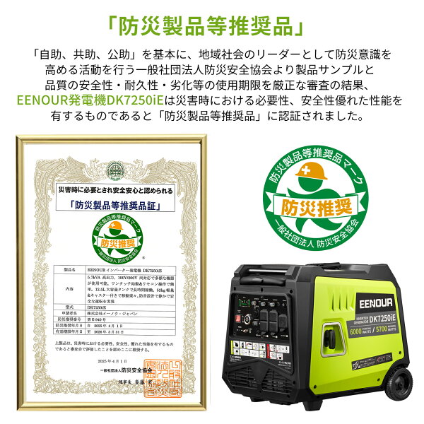 EENOUR DK7250iE 発電機 単相 100V 200V 兼用 【防災推奨品】5700W 大出力 インバーター 発電機 セル発電機 ガソリン 発電機 農用ドローン充電 防音 純正弦波 停電対策 非常用 無人機充電 防災用 園芸用 工事用 避難所給電